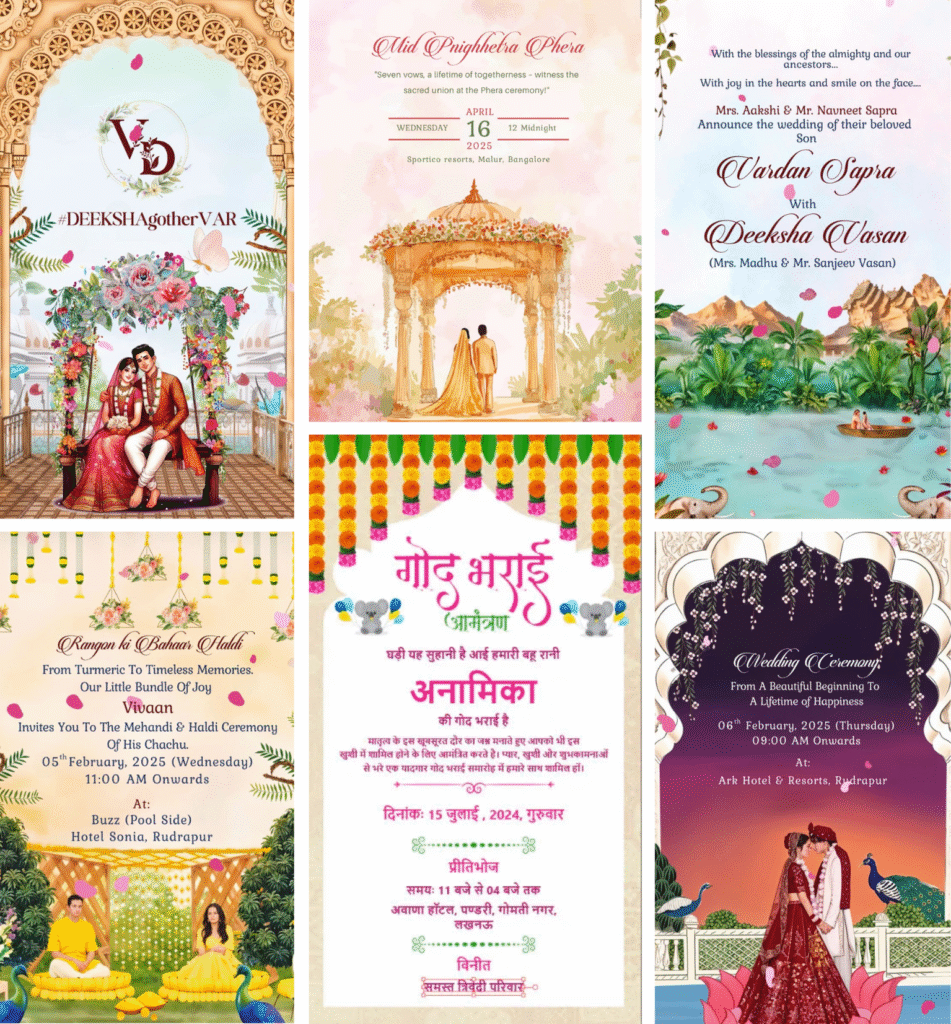 Your wedding invitation is the first glimpse of your big day – why not make it unforgettable? At Trend Your Shaadi, we design stunning digital invitations that blend creativity with elegance. From animated e-invites to beautifully crafted video invites, every design reflects your theme, story, and personality. Easy to share, eco-friendly, and customizable, our digital invites set the perfect tone for your celebrations.